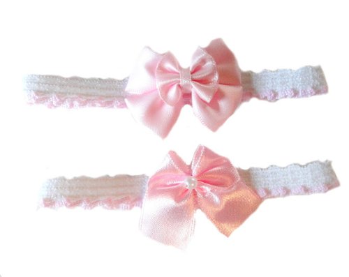 Very Sweet! Set of two!Soft stretchy white lace headbands with soft pink edges.Light pink ribbon bow with pearl and a light pink double bow.Sized for the smallest of infants.Five NICU premature infant and newborn baby sizes!Micro preemie for babies weighing 0-3 pounds; small preemies 3-6 pounds;small infant 5-8 pounds; newborn 0-3 months to 12 pounds and3-6 months to 16 pounds.Please select when ordering.By Jacqui's Preemie Pride