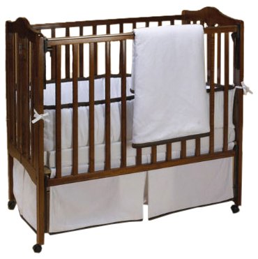 The Forever Mine Cradle Bedding exhibits a unique class, keeping it forever in the spotlight. The sleek lines and fine trim combine to create a bedding set that speaks of certain grace and intrinsic beauty. The crisp white bedding along with the delicate chocolate trimming on the bumper and comforter, add just the right touch of character to this striking set. Set includes a comforter, bumper and fitted sheet to fit cradle size 18x36. Fully manufactured in teh USA. A pleasurable sight for any doting mom.