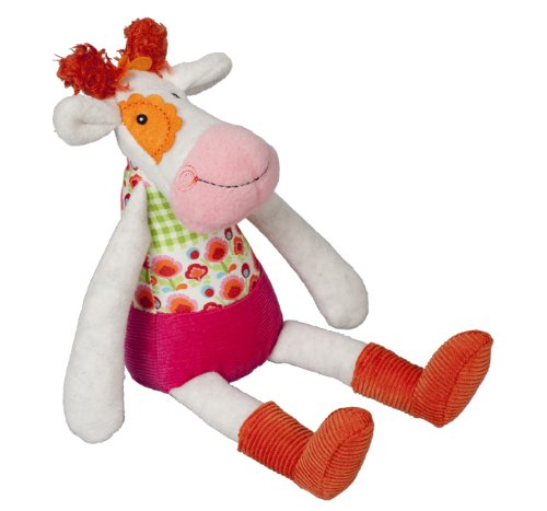 Anemone the Cow features stylish flower power clothes and a rattle inside. This rattle plush is the perfect tag-along companion.