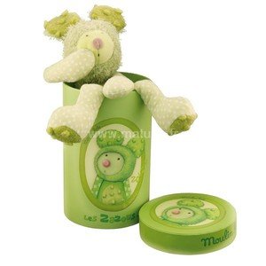 This winsome mouse is a mix of textures in soft green with adorable dotted ears, feet and tummy. Its long legs make it easy to hold...its face makes it easy to love. The Zazous collection from Moulin Roty is a family of long-legged soft and cuddly creatures that come in their own special boxes. Perfect as a child's bedtime buddy or comfort toy. Measures 13 inches tall and is machine washable.