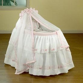 Unveiling a MasterpieceYour baby will bask in elegance and royalty in this designer dream bassinet. The beautiful lining is made of white pique and organza layers, with satin ribbon and gingham seersucker bows for trimming. Completing the masterpiece is an organza hood-valance. Get this bassinet and your nursery will be ready for that special occasion