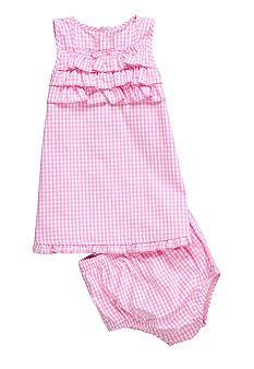 She'll be oh-so-cute in this pink gingham dress with ruffle detail and a matching panty.