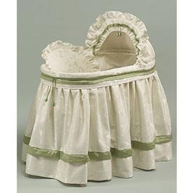Fit for RoyaltySurround your royal offspring with this king majestic bassinet set. Designed from detailed two-tone fabrics and satins, this bassinet set is truly fit for royalty A waistband, accented with thick satin trim and finished with a dainty ribbon, falls in a full gathered floor length skirt. The ruffled hood is accented to match, and boasts delicate roses dangling from the ribbon ends. A bassinet to last for years of enjoyment