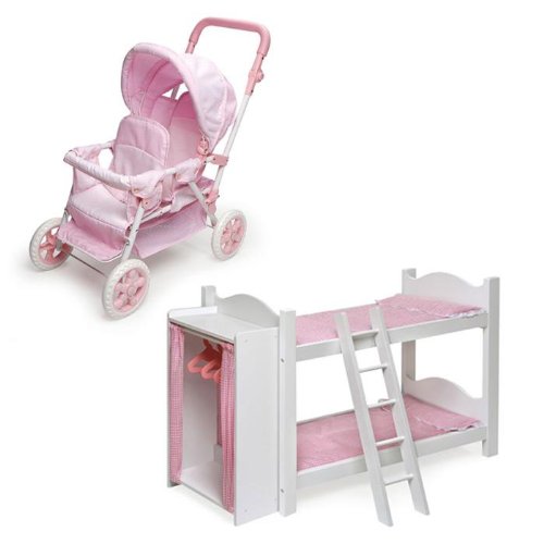 Badger Basket Double Doll Stroller and Bunk Beds with ArmoireWith unprecedented realism, the Badger Basket Double Doll Stroller will keep your daughter's imagination engaged for hours. Realistic details and engaging features such as the full recline option and large canopy are sure to spark your daughter's creativity. The height-adjustable handle and rubber grips provide a comfortable play experience for your growing girl. Two dolls up to 18" will fit in the Double Stroller. If your daugh