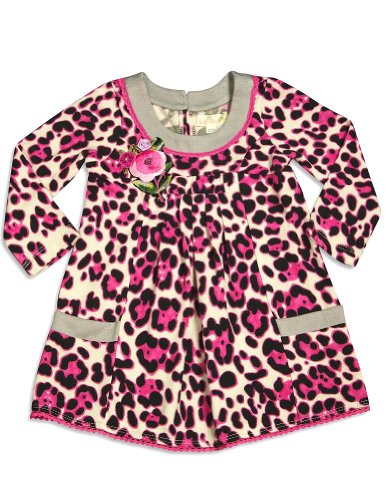 Baby Sara - Infant Girls Long Sleeve Knit Dress, Ivory, Pink, Black, Scoop Neck, Back Button Closure With Keyhole, Front Pleats, Side Pockets, Flower Patches, Leopard Print, Decorative Trim, 65% Polyester 35% Cotton, Made In China, #29181 29-181