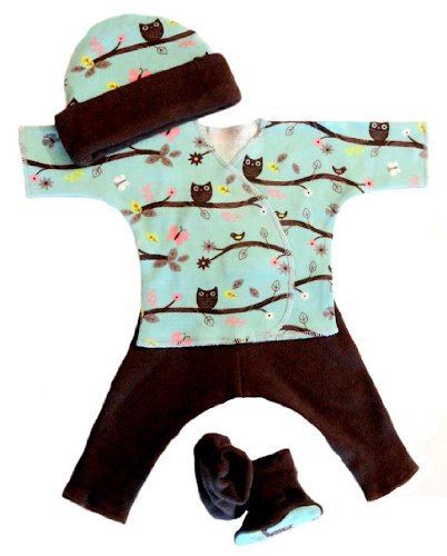 Adorable! 100% soft cotton knit.Long sleeve light green shirt with Velcro closures on front for easy on/off access.Owl, branches, butterflies and flower print.Brown pants with adjustable velcro waist for adjustable fit.Brown booties with Owl print on soles.Matching hat with brown brim.Four premature infant and newborn baby sizes!Micro preemie for babies weighing 0-3 pounds; small preemies 3-6 pounds;small infant 5-8 pounds and newborn 0-3 months to 12 pounds.Please select when ordering.By Jacqui's Preemie Pride