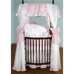 Pretty as a PictureThis dreamy round crib bedding set is made of the softest white pique adorned with lovely gingham seersucker ruffles. The comforter is tufted with a unique pattern of ribbons and bows. Handsome curtains can can be draped or pulled back with ribbons for a striking effect.