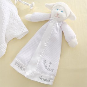 Baby's name, birth date or baptism date will be delicately embroidered on the white satin edge creating a very memorable personalized christening gift."Bless This Child" will be embroidered below a delicate cross to complete the gift.Incredibly soft and cuddly to the touch, our embroidered lamb blankie is a mom's popular choice as baby's security blanket. A favorite among Godparents and Grandparents! Quality crafted of plush, durable acrylic fabric to last years from infant to toddler and more! Blanket measures 14"L, fully lined with white satin trim. Convenient carry-size that won't drag on the floor (or trip baby!) like larger sizes. Great for car rides, trips to Grandma's or travel, when a "full-size" blanket is not necessary. Spot clean.