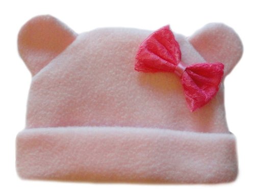 Very Pretty and Cute!Soft light pink fleece hat with teddy bear ears!.Dark pink lace bow on front.Four NICU premature infant and newborn baby sizes:small preemie for babies weighing 3-6 pounds;small infant 5-8 pounds, newborn 0-3 months to 12 pounds.and 3-6 months for babies up to 16 pounds.Please select size when ordering.By Jacqui's Preemie Pride.