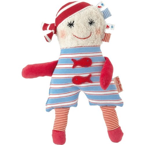 He is made of soft terry cloth and cotton fabrics and filled with polyester wool. The lovely face is hand-stitched and hand-painted with fine detail and gives the toy an individual touch. The hooks invite children to grab and train their fingers. The doll is light and cuddly, your baby will love to handle and cuddle it. Jingling noises awaken the curiosity and invite your child to shake and twist the doll thus training senses and motor skills. Suitable for newborns. Machine wash at 30 degree soft cycle. Size: 10".