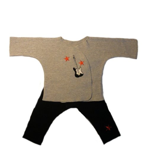 100% soft cotton interlock knit.Heather gray long sleeve shirt with Velcro closureson front for easy on/off dressing.Black guitar and red stars appliques on front.Black pants with adjustable Velcro waist for a softer fit.Gentle against babies belly button.Red star on hem.Four premature infant and newborn baby sizes:micro preemie for babies weighing 0-3 pounds; small preemies 3-6 pounds;small infant 5-8 pounds or newborn 0-3 months to 12 pounds.By Jacqui's Preemie Pride