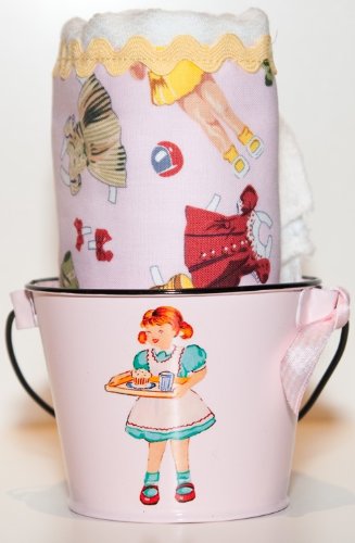 Nothing says retro like paper dolls! How sweet is this burp cloth with this darling pattern of paper dolls and trimmed in rick-rack. It's bundled in a small, 3-inch high enamelware bucket in pink. The bucket is decorated with a little girl decal and a ribbon adorns the handle. Best of all, this gift already comes wrapped in cellophane with a bow. Perfect for gift-giving or just treat yourself!